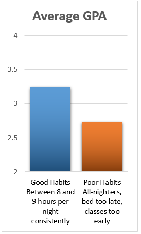 Students who demonstrated good sleep habits, like getting at least eight hours per night, napping, and waking up at a reasonable time received a 3.24 GPA, but students with poor sleep habits came in a half point lower – at a 2.74 GPA1.