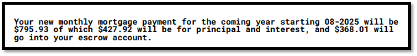 This section provides the breakdown of your updated monthly mortgage payment, including how much goes toward principal and interest, and how much goes into escrow.